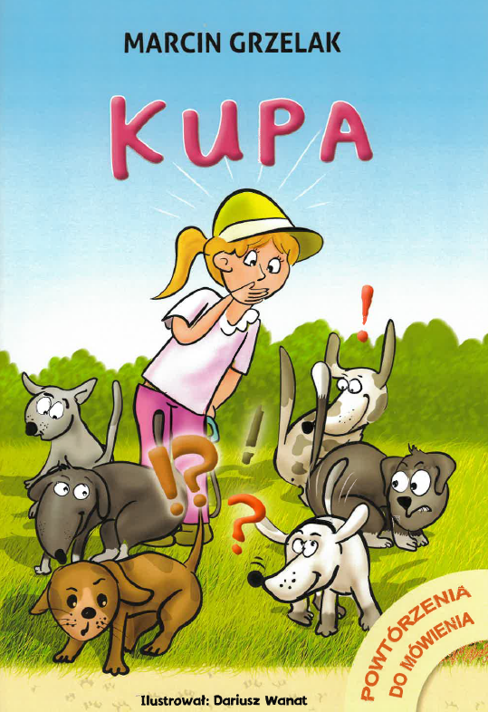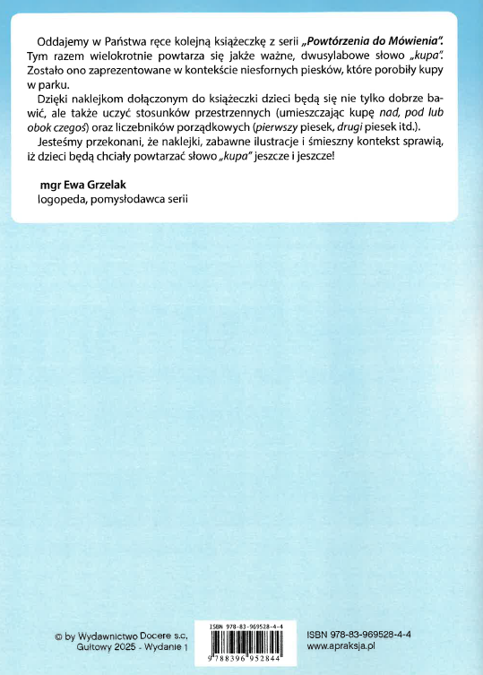 Książka z serii „Powtórzenia do Mówienia”. Tym razem słowem, które powtarza się na każdej stronie jest kupa. Słowo, które służy sygnalizowaniu własnej potrzeby, tu zaprezentowane jest w kontekście niesfornych piesków, które porobiły kupy w parku. Dzięki naklejkom dzieci będą dobrze się bawić, ale i przy okazji uczyć się stosunków przestrzennych umieszczając kupę nad, pod, obok czegoś oraz poznają liczebniki porządkowe (pierwszy piesek, drugi piesek itp.) Jesteśmy przekonani, że naklejki, śmieszne ilustracje, znany kontekst ( któż, nie spotkał kupy w parku:), spowodują, że dzieci będą chciały powtarzać słowo kupa jeszcze i jeszcze.