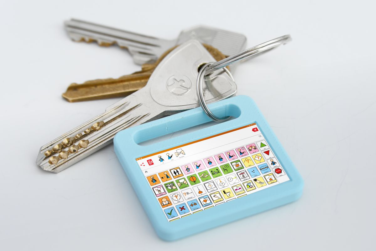 Stylowy brelok w formie miniaturowej atrapy tabletu AAC, idealny jako gadżet dla użytkownika lub „urządzenie” dla ulubionej lalki czy misia. Produkt wykonany jest z wytrzymałego tworzywa i dostępny w trzech wyrazistych kolorach: niebieskim, pomarańczowym oraz zielonym.
